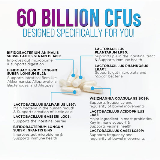 Daily Probiotic for Women & Men 60 Billion CFU 10 Strains Supplement Lactobacillus Probiotics - Digestive Gut & Immune Health Support - Supports Occasional Constipation, Gas & Bloating - 60 Capsules