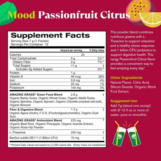 Greens Blend Mood: Super Greens Powder Smoothie Mix with Organic Spirulina, Chlorella, Beet Root Powder, Digestive Enzymes & Probiotics, 15 Servings. Passionfruit Citrus